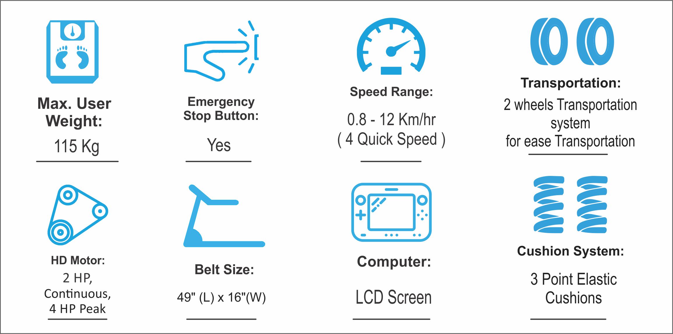 Speed Range : 0.8 -12 Km/Hr (4 Quick Speed)